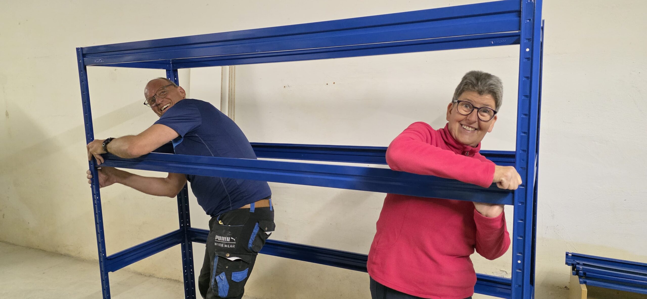 Ein besonderer Schwerpunkt lag auf dem Aufbau mehrerer stabiler Schwerlastregale, die künftig für deutlich mehr Ordnung und Übersicht sorgen werden. Diese Regale bieten nun ausreichend Platz für Aktionselemente, Einsatzmittel sowie Informationsmaterialien, die für die vielfältigen Aufgaben der Verkehrswacht regelmäßig benötigt werden.